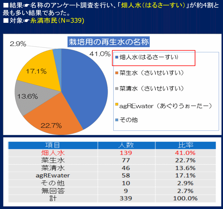 糸満市の「農業用再生水」は「畑人水(はるさーすい)」という愛称がぴったりだという調査結果に至り、糸満市の再生水検討委員会を経て採用されました。